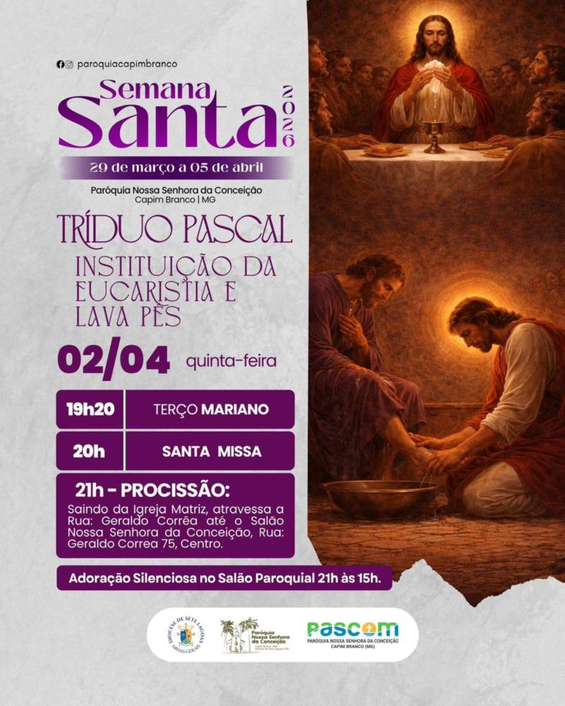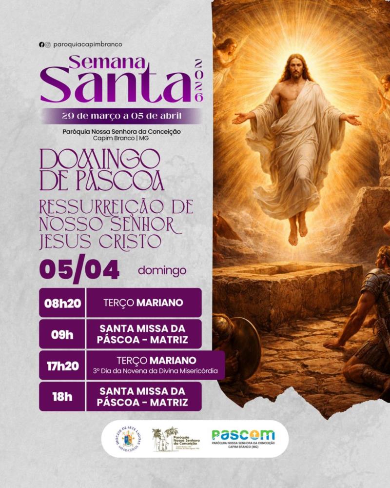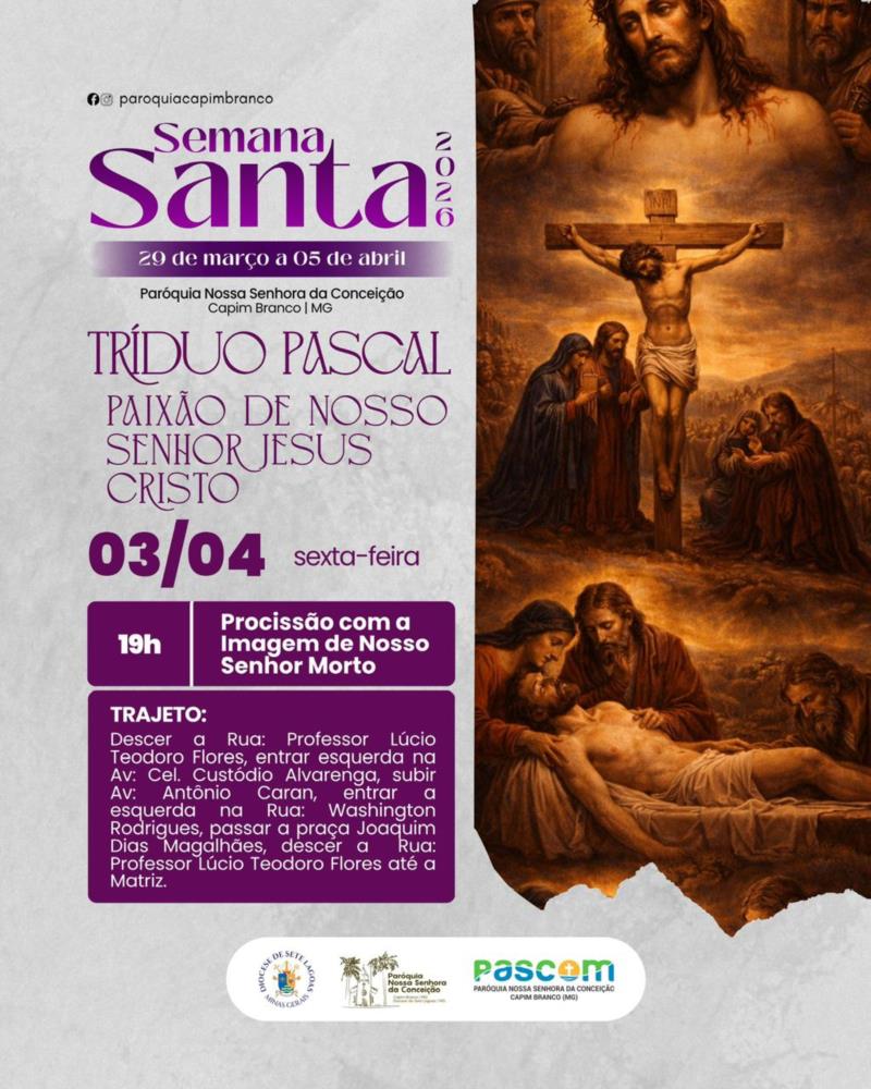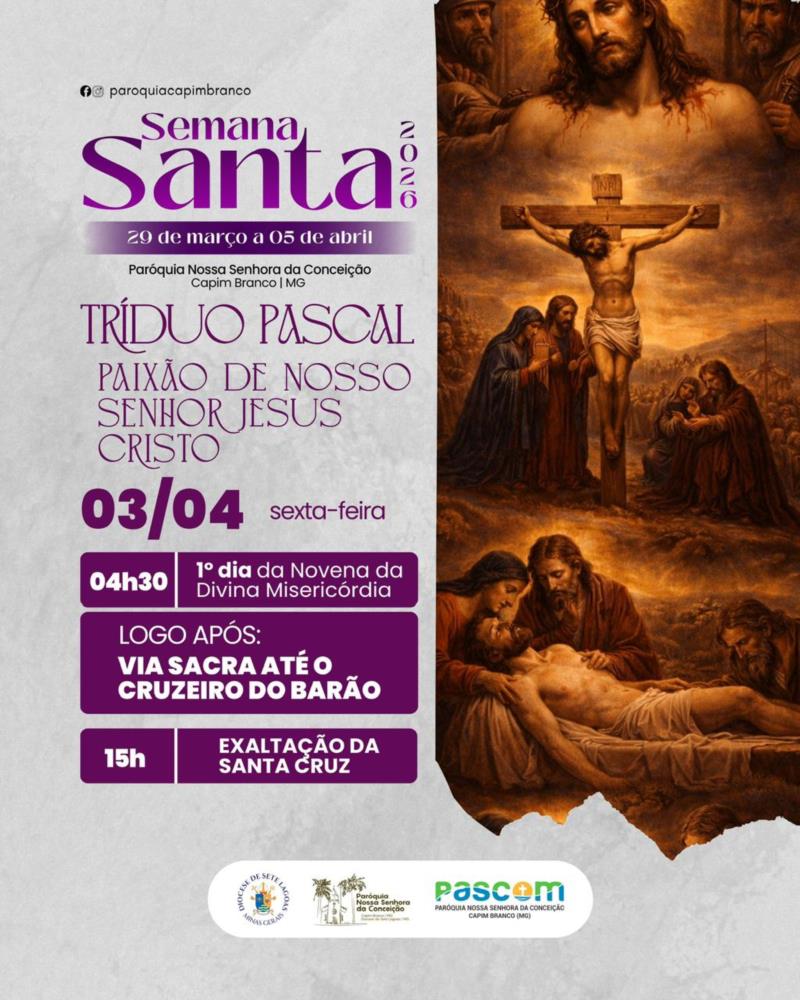 A Paróquia Nossa Senhora da Conceição, em Capim Branco, divulgou a programação oficial da Semana Santa 2026, período de grande importância para a fé cristã, marcado por celebrações que recordam a paixão, morte e ressurreição de Jesus Cristo.