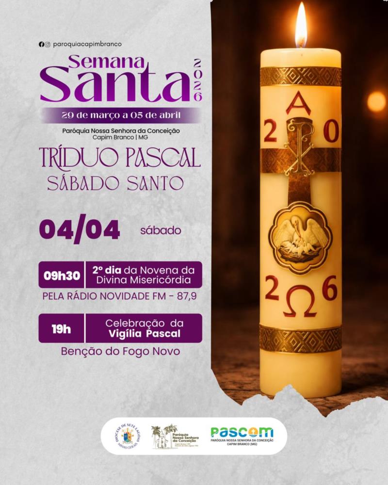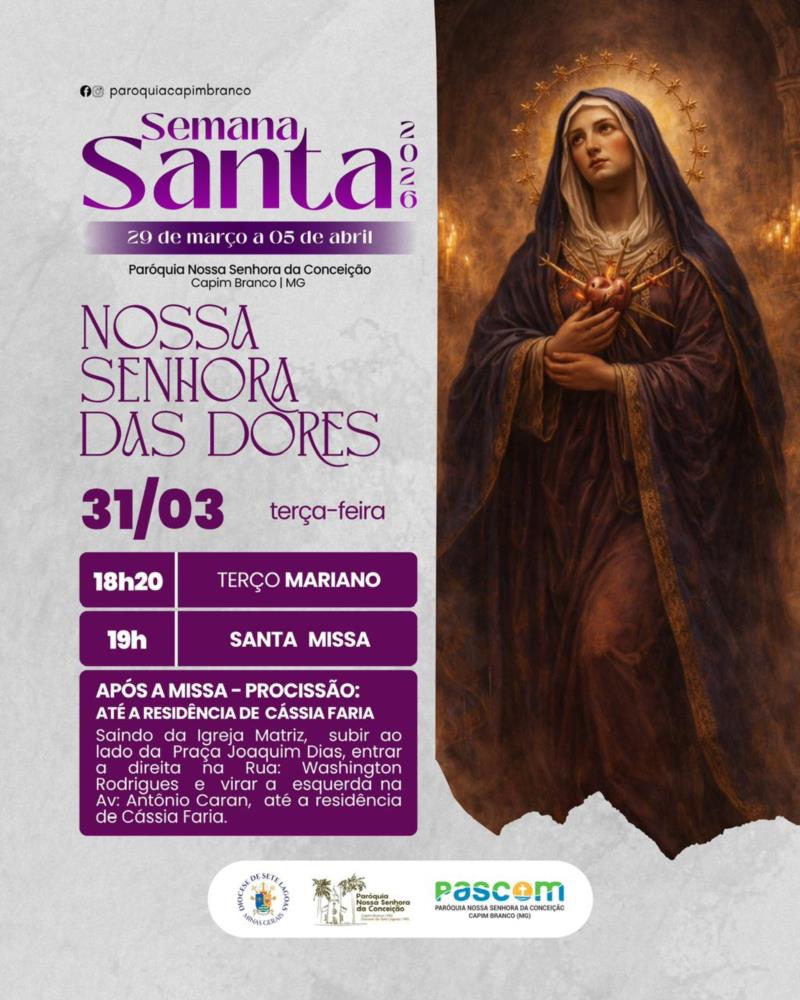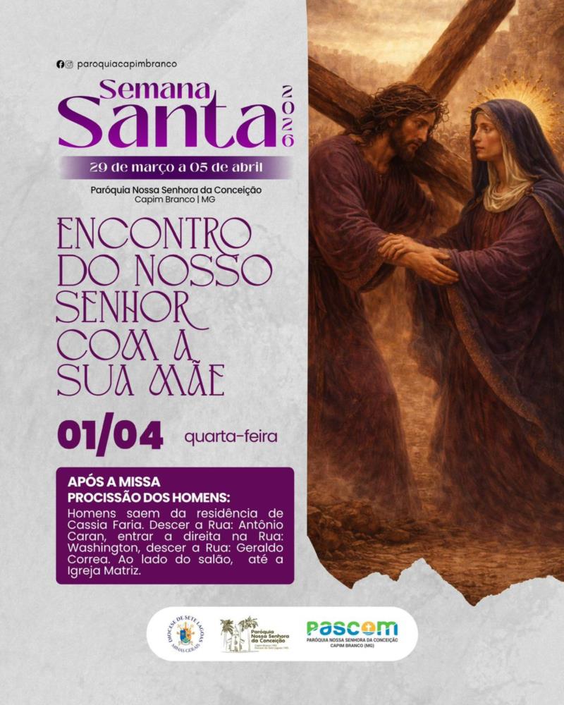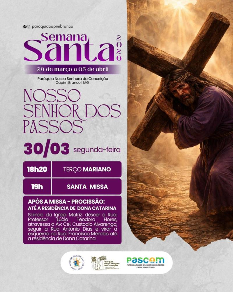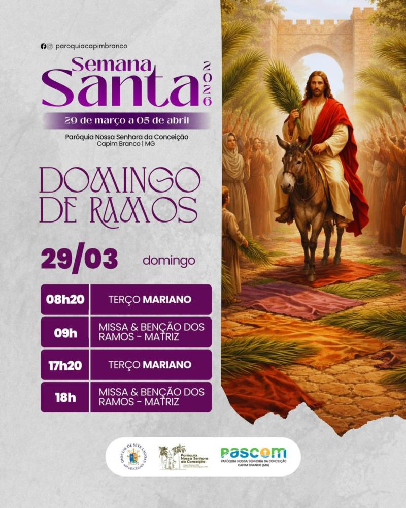 A Paróquia Nossa Senhora da Conceição, em Capim Branco, divulgou a programação oficial da Semana Santa 2026, período de grande importância para a fé cristã, marcado por celebrações que recordam a paixão, morte e ressurreição de Jesus Cristo.