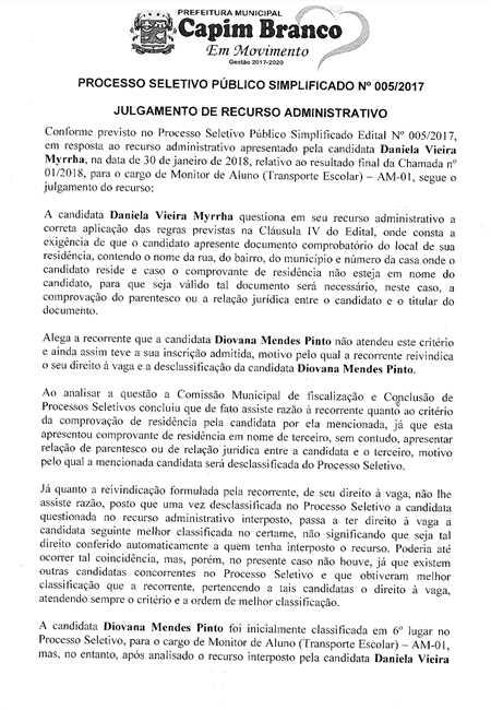 A Secretaria Municipal de Educação divulga o Julgamento de Recurso Administrativo referente ao Processo Seletivo Público Simplificado nº 005/2017.
