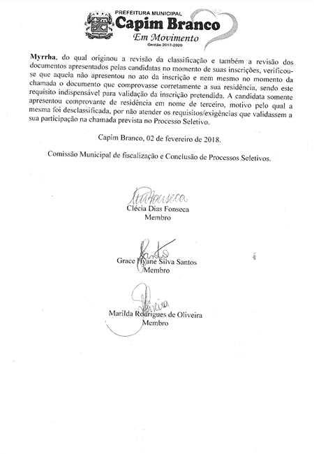 O julgamento foi realizado pela Comissão Municipal de fiscalização e Conclusão de Processos Seletivos.