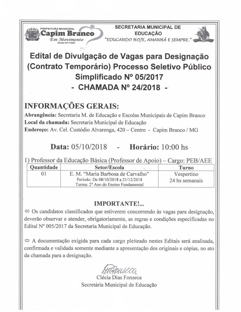 A chamada para o cargo de Professor de Educação Básica (Professor de Apoio) será realizada nesta sexta-feira (05/10) às10 horas, na Secretaria Municipal de Educação (Av. Coronel Custódio Alvarenga, nº 420, Centro).