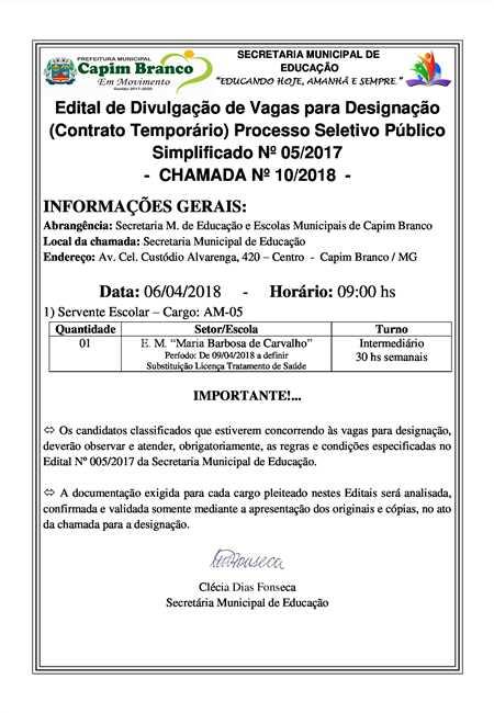 A Secretaria Municipal de Educação torna público o Edital de Designação para contratos temporários – Processo Seletivo Público Simplificado Nº 005/2017 – Chamada 10/2018.