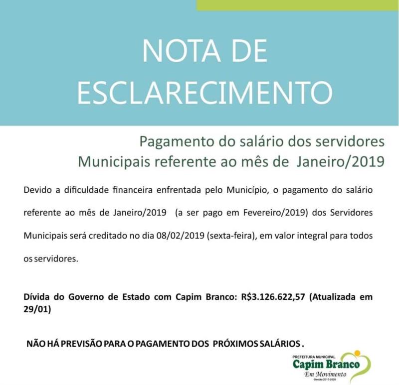 Pagamento do salário dos servidores referente ao mês de Janeiro/2019.
