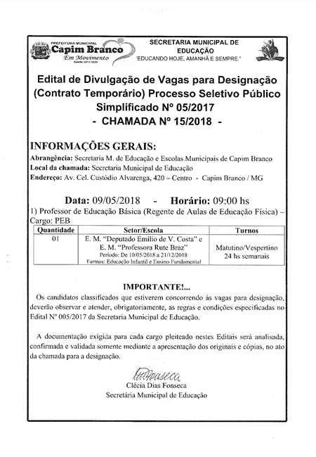 A chamada para o cargo de Professor de Educação Básica (Regente de Aula de Educação Física) será realizada nesta quarta-feira (09/05) às 09 horas, na Secretaria Municipal de Educação (Av. Coronel Custódio Alvarenga, nº 420, Centro).