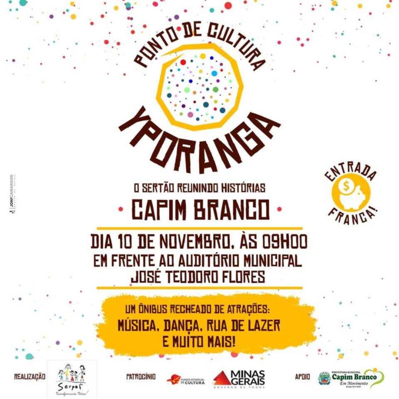 No dia 10 de novembro, próximo sábado, às 9 horas será realizado o Ponto de Cultura Yporanga – Sertão reunindo histórias Capim Branco, um ônibus recheado de atrações, música, dança, rua de lazer e muito mais.