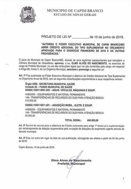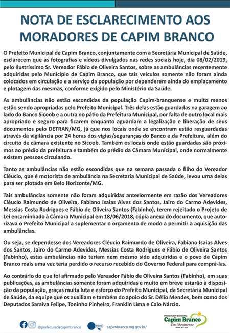 O Prefeito Municipal de Capim Branco, conjuntamente com a Secretária Municipal de Saúde, esclarecem que as fotografias e vídeos divulgados nas redes sociais hoje, dia 08/02/2019, pelo Ilustríssimo Sr. Vereador Fábio de Oliveira Santos, sobre as ambulâncias recentemente adquiridas pelo Município de Capim Branco, que tais veículos somente não foram ainda colocados em circulação e a serviço da população por dependerem ainda do emplacamento e plotagem das mesmas, conforme exigido pelo Ministério da Saúde.