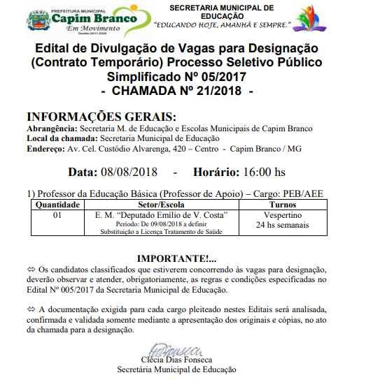 A chamada para o cargo de Professor de Educação Básica (Professor de Apoio) será realizada nesta quarta-feira (08/07) às16 horas, na Secretaria Municipal de Educação (Av. Coronel Custódio Alvarenga, nº 420, Centro).