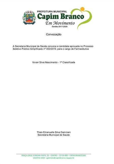 A Secretaria Municipal de Saúde convoca a candidata aprovada no Processo Seletivo Público Simplificado nº 002/2019 e informa que a mesma deverá comparecer na sede da Secretaria (situada na Rua Salatiel Alves de Deus, nº 21, Centro), nesta sexta-feira (dia 10/05), a partir das 8 horas, portanto todos os documentos conforme Edital.