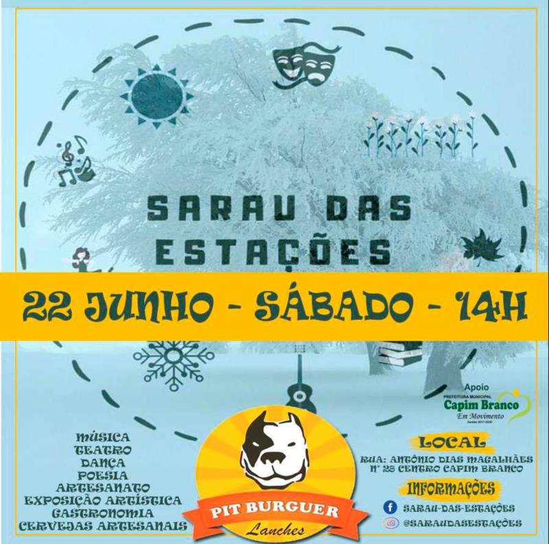 O Espaço Pitburguer Lanches, com apoio da Prefeitura Municipal de Capim Branco, realizará no dia 22 de junho, sábado, a partir das 14 horas, o Sarau das Estações. O evento será na rua Antônio Dias Magalhães, 28, Centro, e terá apresentações de musica, teatro, dança e poesia, além de exposição de artesanato e uma rica experiência gastronômica e degustação de cervejas artesanais.