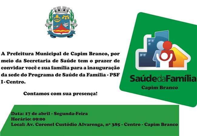 A Prefeitura Municipal de Capim Branco, por meio da Secretaria de Saúde tem o prazer de convidar você e sua família para a inauguração da sede do Programa de Saúde da Família – PSF I - Centro, no dia 17 de abril (Segunda-feira) às 09 horas na Avenida Coronel Custódio Alvarenga, nº 385, Centro – Capim Branco.