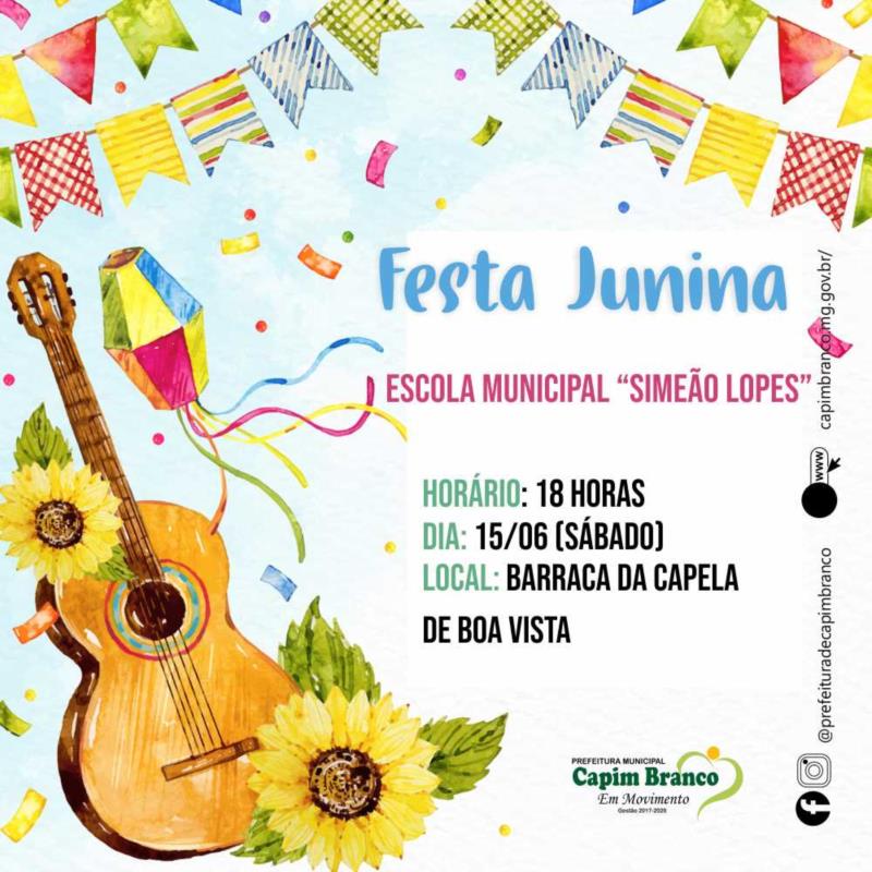 A Prefeitura Municipal por meio da Secretaria Municipal de Educação, alunos e professores da Escola Municipal Simeão Lopes, convidam a todos para participarem da Festa Junina, neste Sábado (15/06), às 18 horas na barraca da Capela de Boa Vista.