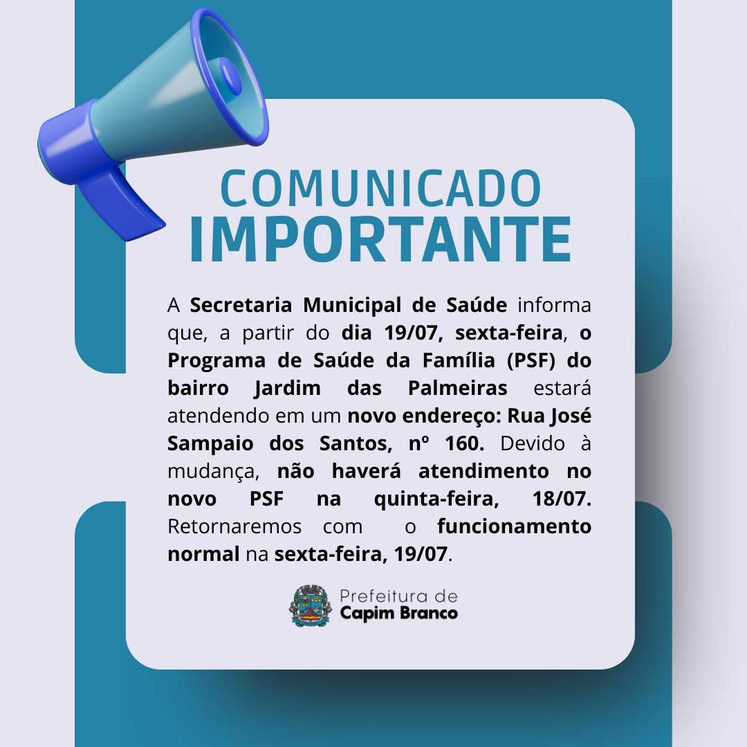 A Secretaria Municipal de Saúde informa que, a partir do dia 19/07, sexta-feira, o Programa de Saúde da Família (PSF) do bairro Jardim das Palmeiras estará atendendo em um novo endereço: Rua José Sampaio dos Santos, nº 160.