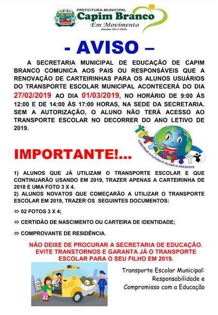 A Secretaria Municipal de Educação comunica aos pais ou responsáveis que a renovação de carteirinhas para os alunos usuários do Transporte Escolar Municipal acontecerá do dia 27/02 ao dia 01/03, no horário de 9 às 12 e de 14 às 17 horas, na sede da Secretaria, situada na Av. Coronel Custódio Alvarenga, nº 420, Centro. Sem a autorização, o aluno não terá acesso ao Transporte Escolar no decorrer do Ano Letivo de 2019.