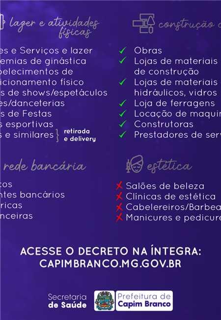 Capim Branco na Onda Roxa! Confira o resumo dos estabelecimentos que abrem e fecham em nosso Município de acordo com o novo Decreto Municipal nº 2.218/2021.