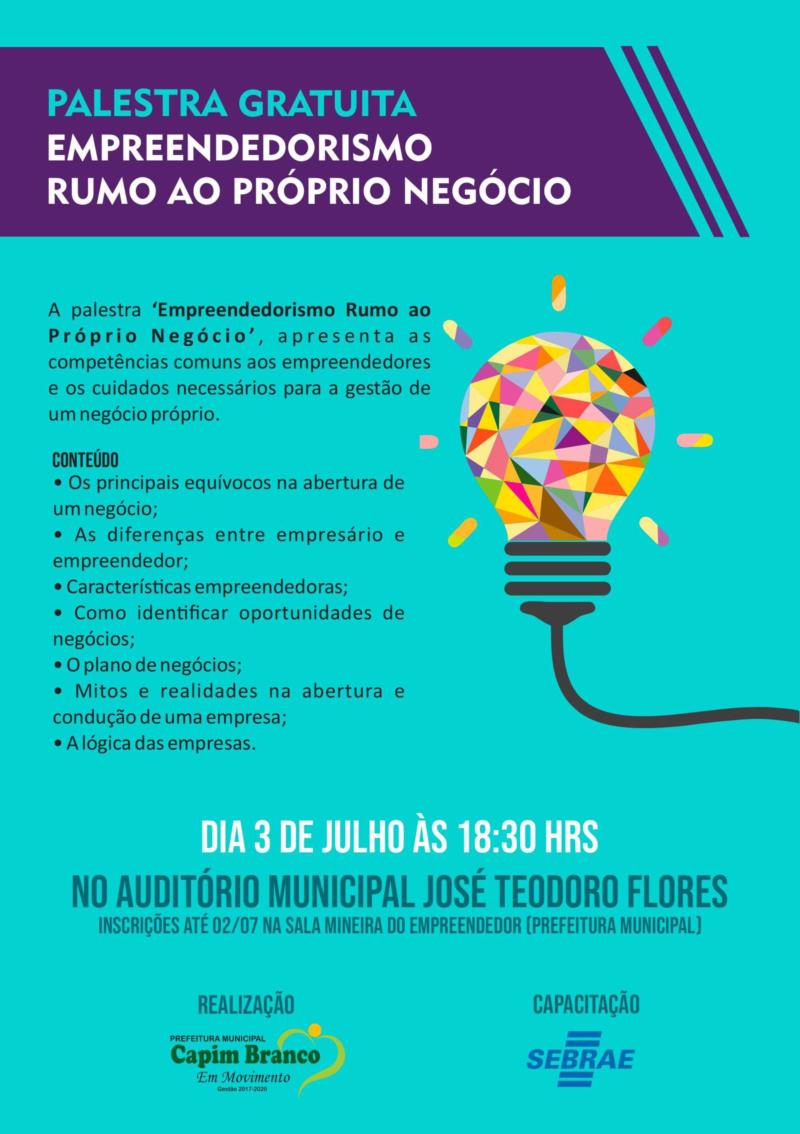 A Prefeitura de Capim Branco em parceria com o SEBRAE, realizará no dia 3/07 (quarta-feira), a palestra Empreendedorismo Rumo ao Próprio Negócio, às 18:30 hrs, no Auditório Municipal José Teodoro Flores “Ribita”.