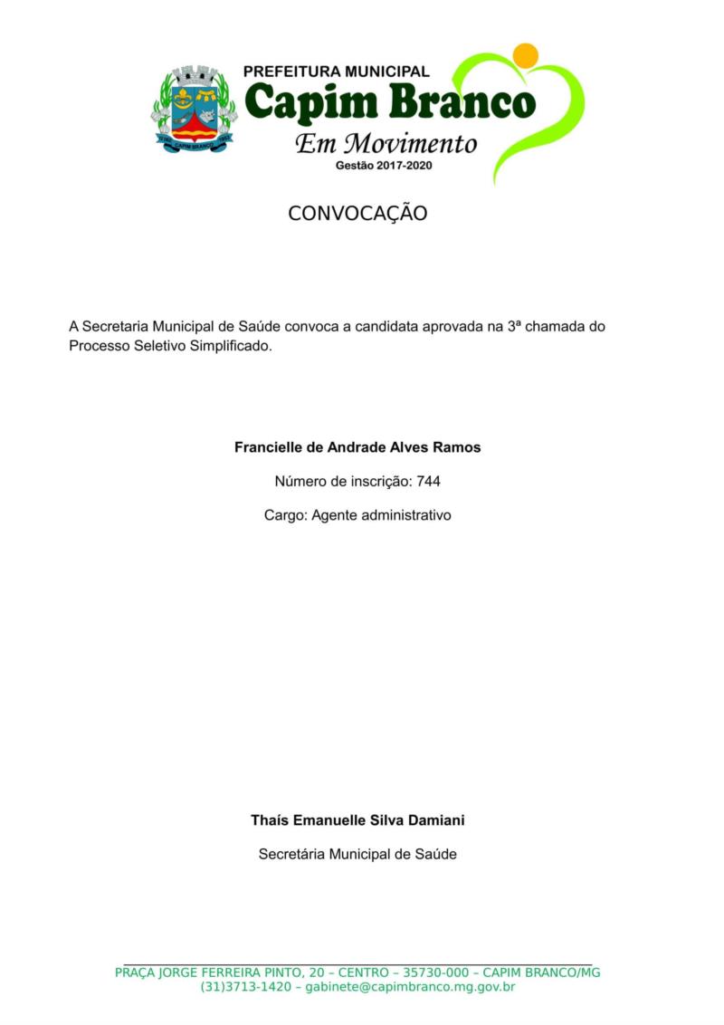 A Secretaria Municipal de Saúde divulga a convocação de candidata aprovada no Processo Seletivo Simplificado 2018, que deverá comparecer, AMANHÃ (22/01), às 10 horas na Secretaria Municipal de Saúde (Rua Tenente Salvelino G. Ribeiro, nº 410, Centro).