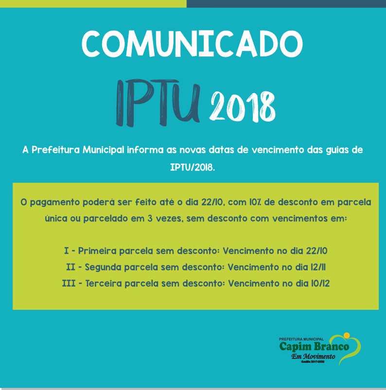 A Prefeitura Municipal informa as novas datas de vencimentos das guias de IPTU/2018.