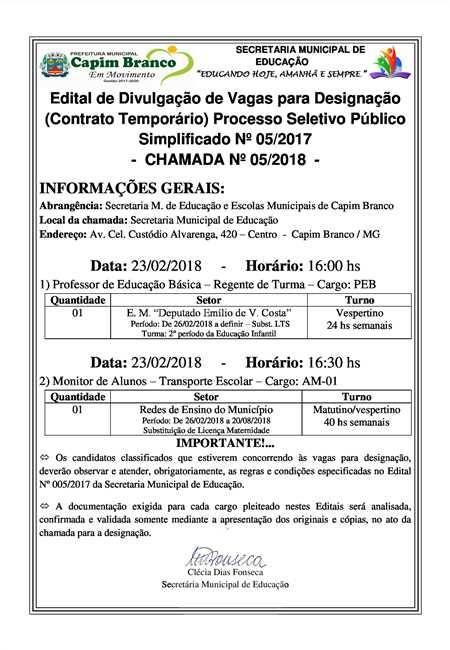A Secretaria Municipal de Educação divulga o Edital de Vagas para Designação (Contrato Temporário) – Processo Seletivo Público Simplificado nº 05/2017 – Chamada nº 04/2018, que acontecerá nesta sexta-feira (23/02).