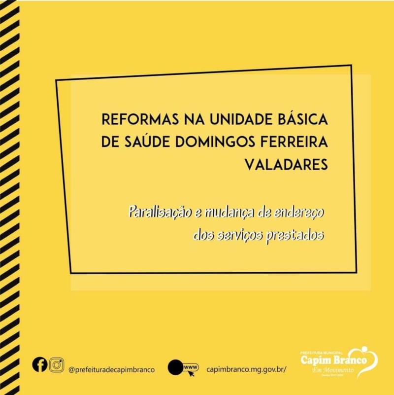 Devido ao início das obras de Reforma da Unidade Básica de Saúde Domingos Ferreira Valadares, a Secretaria Municipal de Saúde comunica a toda população sobre as datas de paralisação e mudança de endereço dos serviços prestados.