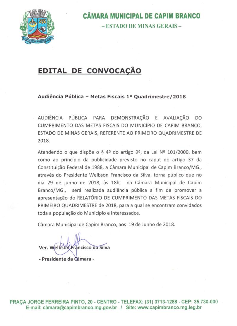 No dia 29 de junho será realizada a Audiência Pública para promover a apresentação do relatório de cumprimento das Metas Fiscais do Primeiro Quadrimestre/2018, que acontecerá na Câmara Municipal de Capim Branco às 18 horas. Todos os munícipes e interessados estão convidados.
