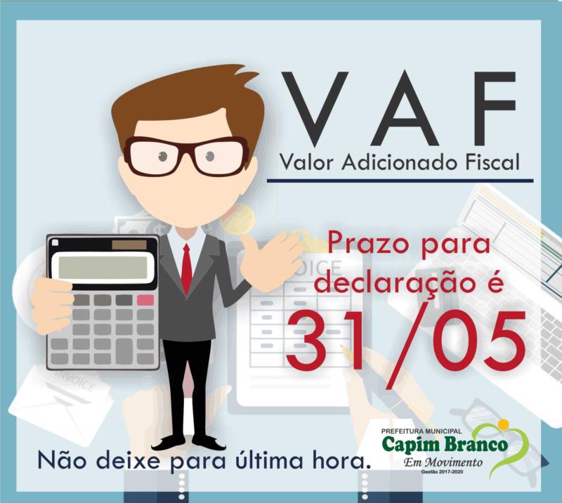 Valor Adicionado Fiscal (VAF) é um indicador econômico-contábil utilizado pelo Estado para calcular o índice de participação municipal no repasse de receita do Imposto sobre Operações relativas à Circulação de Mercadorias e sobre Prestações de Serviços de Transporte Interestadual e Intermunicipal e de Comunicação (ICMS) e do Imposto sobre Produtos Industrializados (IPI) aos municípios mineiros. É apurado pela Secretaria de Estado de Fazenda de Minas Gerais (SEF-MG), com base em declarações anuais apresentadas pelas empresas estabelecidas nos respectivos municípios através do VAF/DAMEF, lembrando que as empresas que prestaram serviços no território municipal também devem declarar seu VAF/DAMEF no município. Lembrando que o VAF é preenchido com base nas informações contábeis e econômicas do ano anterior, ou seja, você vai declarar as informações de 2017.