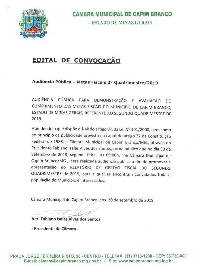 A Prefeitura Municipal convida a todos os munícipes e interessados a participarem da Audiência Pública para demonstração e avaliação do cumprimento das metas fiscais do município de Capim Branco, referente ao 2º Quadrimestre de 2019, a realizar-se no dia 30/09 (segunda-feira), às 9h, na Câmara Municipal de Capim Branco.