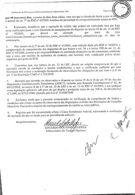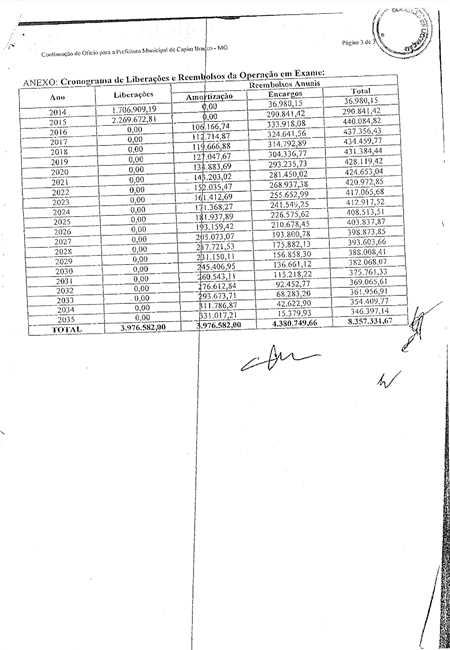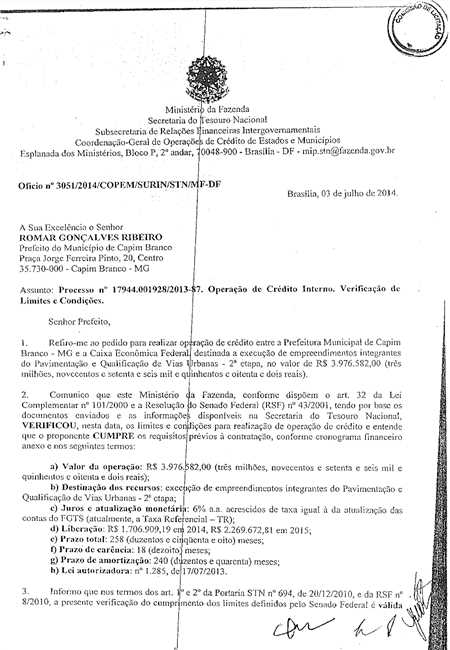 A gestão anterior deixou ainda como encargo do Município de Capim Branco o débito proveniente do financiamento de mais de R$4.000.000,00 (Quatro milhões de reais) contraído junto à Caixa Econômica Federal. Em decorrência deste financiamento o Município encontra-se endividado pelos próximos 21 (vinte e um) anos, tendo obrigação de desembolsar mensalmente durante esses 21 anos o valor aproximado de R$35.000,00 (Trinta e cinco mil reais).