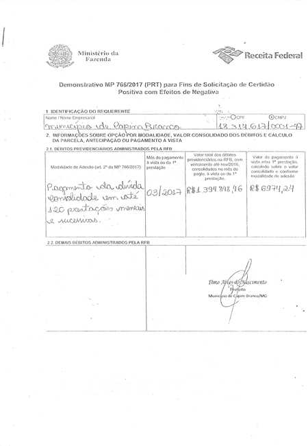 Além desse débito relativo à folha de pagamento, no montante de quase R$800.000,00 (Oitocentos mil reais), a gestão anterior deixou ainda imenso débito previdenciário junto à Receita Federal do Brasil, compreendido em mais de R$1.300.000,00 (Um milhão e trezentos mil reais), cujo débito a gestão atual também conseguiu parcelar, em março de 2017, documento anexo, depois do dissabor de ter bloqueada integralmente a primeira parcela do FPM recebido em janeiro/2017, cuja medida acarretou muitos outros graves problemas ao Município de Capim Branco, que é carente de recursos e conta com cada centavo do FPM - Fundo de Participação dos Municípios para quitar as inúmeras despesas fixas que possui.