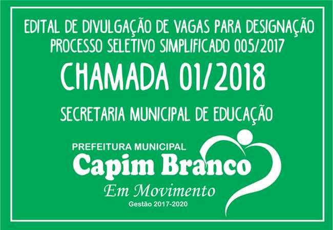 A Secretaria De Educação divulga o Edital de vagas para Designação conforme o Processo Seletivo Público Simplificado nº 005/2017 – Chamada nº 01/2018, que será realizada no dia 30 de janeiro de 2018 (terça-feira), na Secretaria Municipal de Educação (Av. Coronel Custódio Alvarenga, 420, Centro), para os seguintes cargos:
