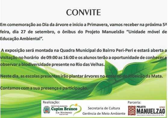 A Secretaria Municipal de Cultura e a Gerência de Meio Ambiente convidam para a visitação da exposição do projeto Manuelzão - Unidade Móvel de Educação Ambiental, que será realizada nesta quinta-feira de 9 às 16 horas na Quadra Municipal do Bairro Peri-Peri. Os alunos das escolas presentes irão plantar árvores no entorno do Ribeirão da Mata. Participe.