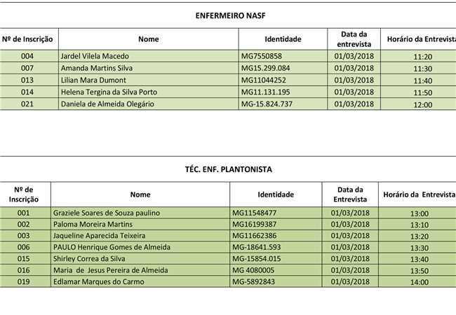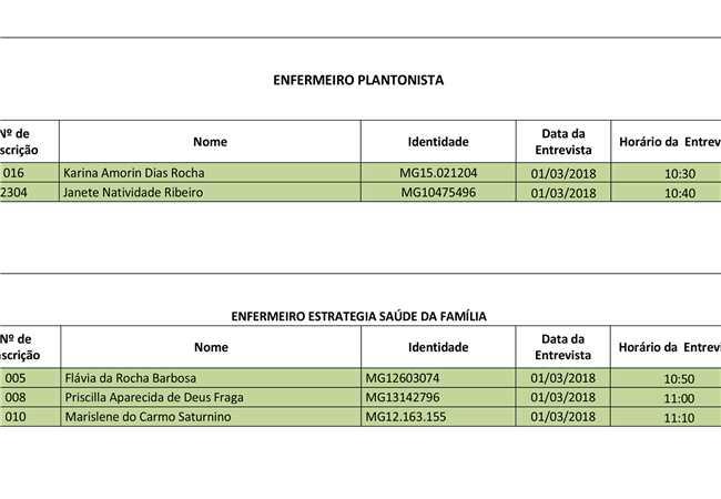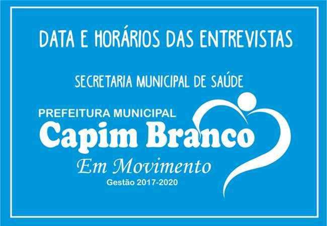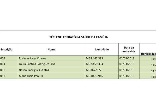 A Secretaria Municipal de Saúde divulga a data e os horários da entrevista para os candidatos inscritos no Processo Seletivo nº 001 e 002/2018, que acontecerão no dia 01/03 na Rua Tenente Salvelino Gonçalves Ribeiro, nº 410, Centro. Os candidatos devem trazer documento com foto e não haverá tolerância no horário. Caso o candidato não compareça ao local da entrevista, este será automaticamente desclassificado.