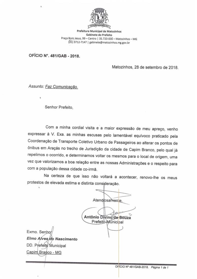 Imediatamente o Sr. Elmo contactou o Prefeito Municipal de Matozinhos, o Dr. Antônio Divino de Souza, e pediu ao mesmo que averiguasse os fatos, sendo prontamente atendido, conforme ofício anexo, no qual o DD. Prefeito Municipal de Matozinhos informa a retificação do equívoco praticado pela Coordenação de Transporte Coletivo Urbano de Passageiros daquele município, bem como pede desculpas pelos fatos e também expressa imenso carinho, respeito e consideração pela população desta cidade e também por este lugar, o qual o mesmo denomina carinhosamente de "cidade co-irmã