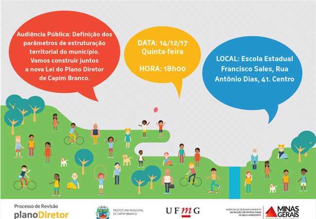 O Plano Diretor é um instrumento usado no planejamento municipal, em seus aspectos sociais, econômicos e físicos. Ele é elaborado com a união da Prefeitura, dos vereadores e da sociedade civil. Por isso não deixe de participar da próxima reunião, que acontecerá dia 14 de dezembro na Escola Estadual Francisco Sales das 18 às 21:30 horas. O evento tem o objetivo de apresentar e discutir propostas para revisão do Plano Diretor de Capim Branco.