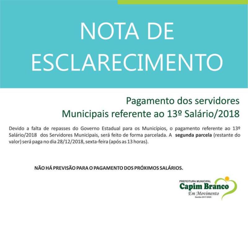 Nota de Esclarecimento: Pagamento do 13º Salário dos Servidores Públicos Municipais 2ª Parcela.