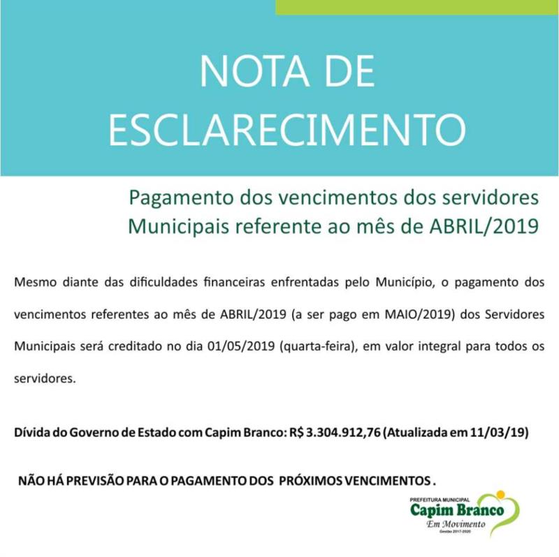 Mesmo diante das dificuldades financeiras enfrentadas pelo Município, o pagamento dos vencimentos dos servidores referentes ao mês de ABRIL, a ser pago em MAIO/2019, será creditado no dia 01/05 (quarta-feira), en valor integral para todos os servidores.