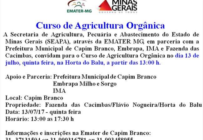 Estão abertas as inscrições para o Curso de Agricultura Orgânica, promovido pela SEAPA, através da EMATER-MG, em parceria com a Prefeitura Municipal de Capim Branco, Embrapa, IMA e Fazenda das Cacimbas.