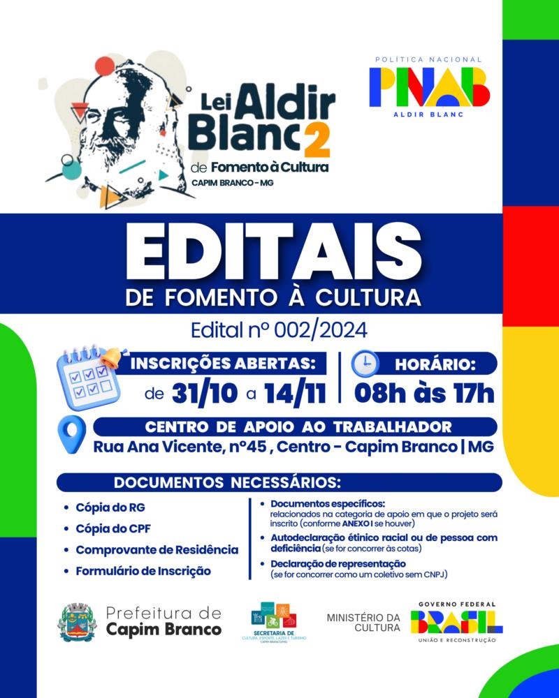 Edital 002/2024 - Fomento à Cultura: Este edital é voltado para agentes culturais que desejam propor e executar projetos culturais que valorizem a cultura local. É uma oportunidade para promover ações que fortaleçam a diversidade e a expressão cultural de Capim Branco.